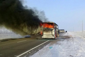 The bus, carrying 55 passengers and two drivers, was travelling along a remote road in the northwestern Aktobe region when it burst into flames on Thu..