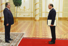 The ceremony of presenting credential letters to President of Tajikistan Emomali Rahmon by Ambassador of Kazakhstan Askar Tazhibayev held at the Palac..