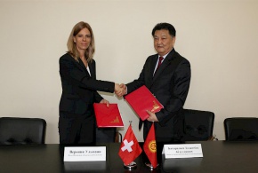 The Ambassador of Switzerland to the Kyrgyz Republic Mrs. Véronique Hulmann and the Minister of Health of the Kyrgyz Republic, Mr. Talantbek Batyralie..
