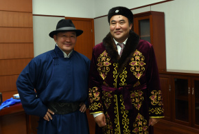 Moñğoliyanıñ prezideti Qaltıma Battwlğa men Moñğoliya Wlı Qwrılınıñ deputatı Mwrat Däkeywlı ekeuiniñ wlttıq kiimderimen tüsken osıbir fotosı közge son..